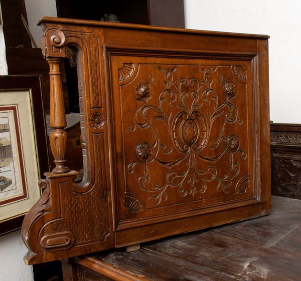 Cuccetta da nave inizi '900 con base a 2 cassetti e laterali in legno impiallacciato scolpito a rilievo, condizioni mediocri.