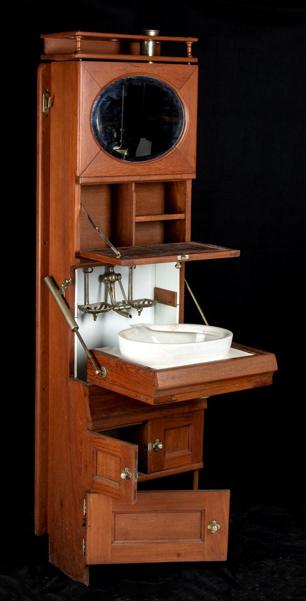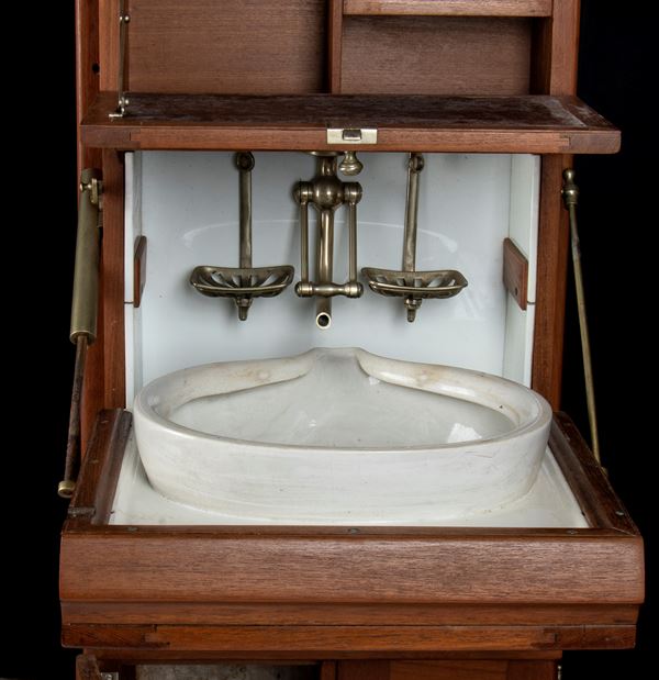 Mobile lavandino in legno teak, originale, inizi del XX secolo. Verticale, con sportelli e ante, contenenti acquamanile in ceramica bianca, accessori porta sapone, specchio orientabile, vani per salviette.