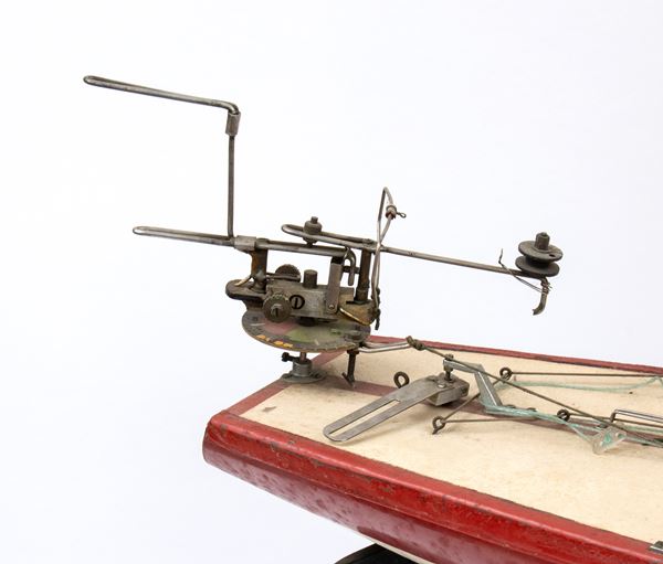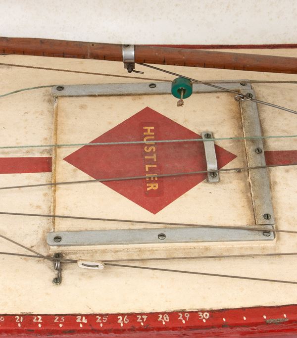 In legno, provvista di motore a controllo radiocomandato (non fornito); su base in mogano; targhetta marcata Hustler. Buone condizioni. Il modellino ha fatto parte degli oggetti di scena di un film di Francesco Nuti.