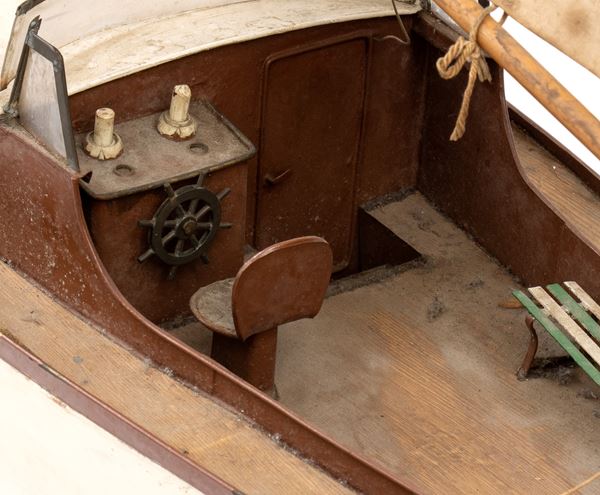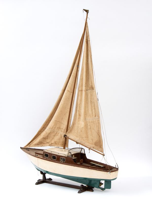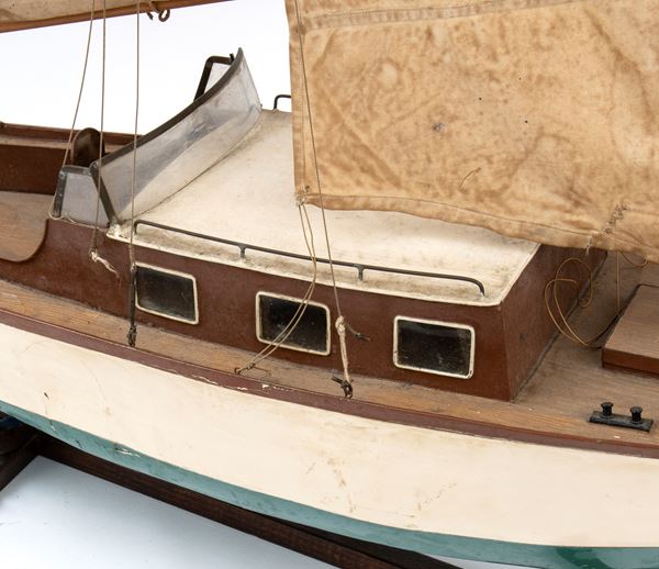 Modello di imbarcazione cabinata in legno su base in mogano. Condizioni accettabili, lievi danni alla chiglia.