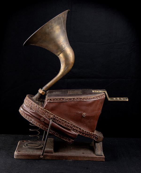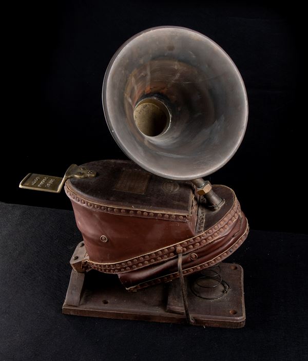 Corno per allarme a bordo, FIRE HORN o allarme per nebbia. Inizialmente usati nella fine '800 come pompe per aria per palombari (vedi la targhetta dei codici di segnalazione, originale in ottone) vengono convertiti in corni per avvisare di sopraggiunti pericoli a bordo dell'imbarcazione. In legno, tromba in ottone, cuoio del mantice in ottime condizioni, funzionante