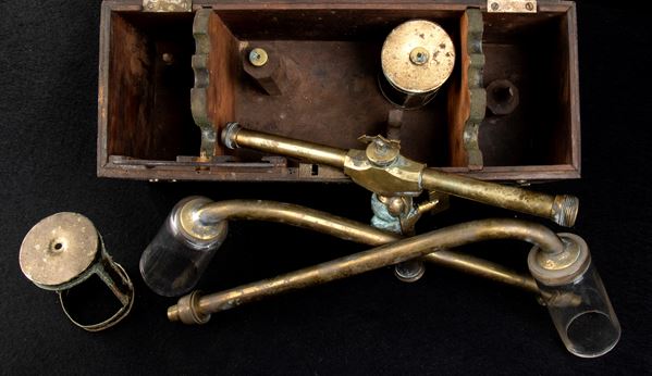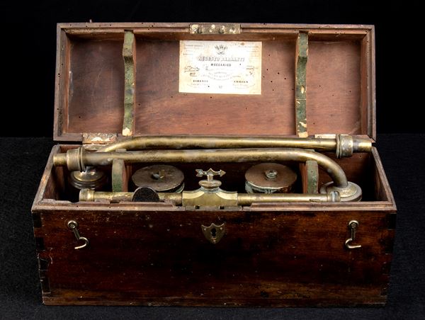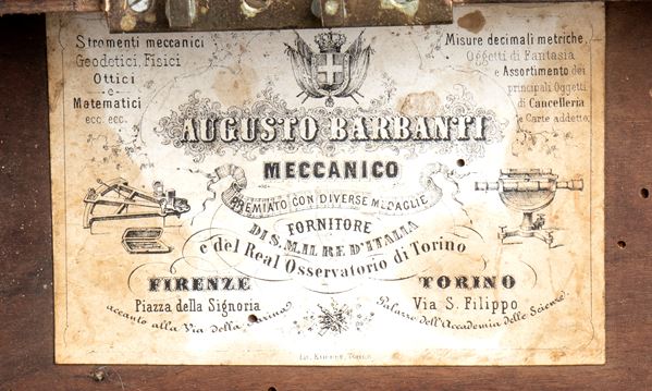 Non meglio identificato, strumento ottico/meccanico in metallo con parti in vetro, nella sua scatola di legno originale, con targhetta AUGUSTO BARBANTI MECCANICO FORNITORE DI S.M. IL RE D'ITALIA e del Real Osservatorio di Torino.
