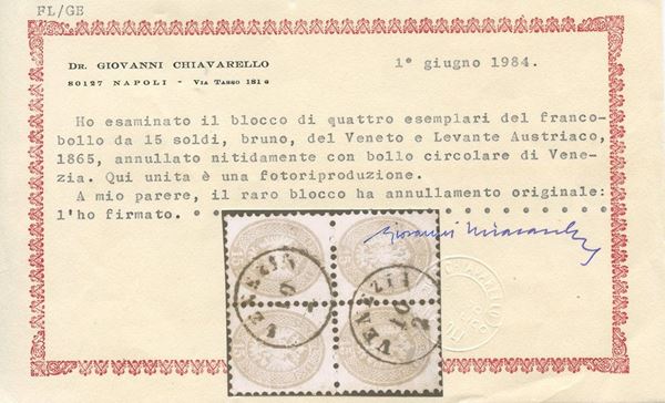 1864, 15 soldi bruno n.45 in quartina usata. Cat. 8.500. (A) (Raybaudy, cert. Chiavarello)