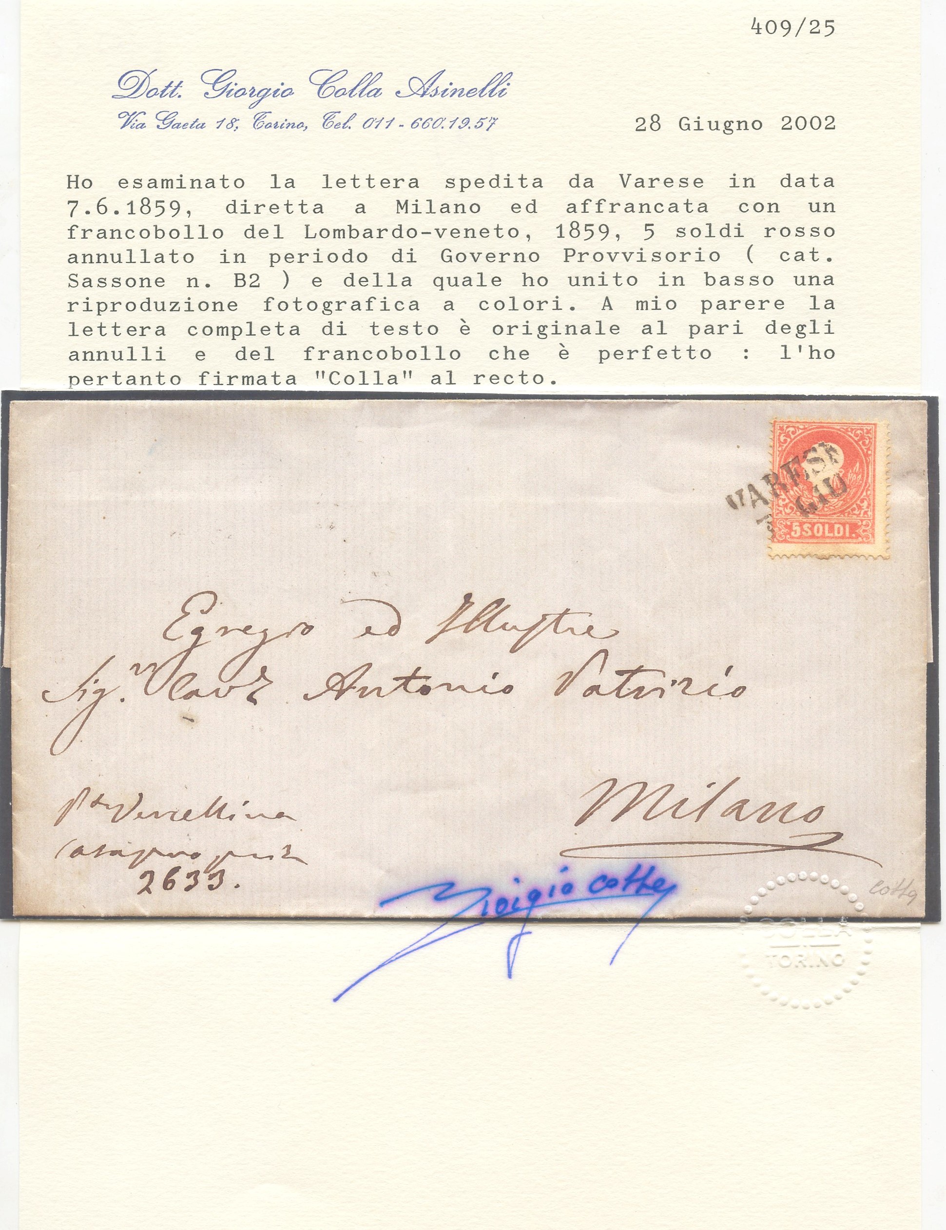 07.06.1859 - Lettera completa di testo spedita da Varese per Milano il 7 Giugno 1859 durante il periodo della definitiva liberazione della città dagli Austriaci (5 Giugno/7 Giugno, pt.R3). Grande rarità del settore. cat. 52.500. (A) (Cert. Colla)