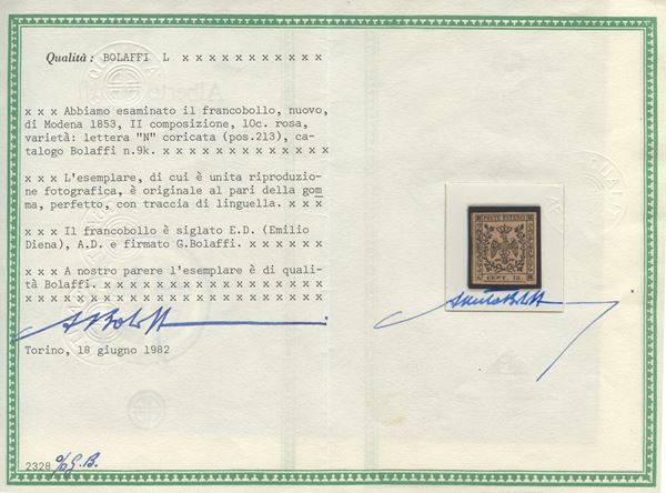 1854 - 10 cent. rosa con punto dopo le cifre n.9i con la N di CENT coricata, nuovo con gomma originale, linguellato. Cat. 24.000. (A+) (Cert. Bolaffi, Emilio Diena, Alberto Diena)