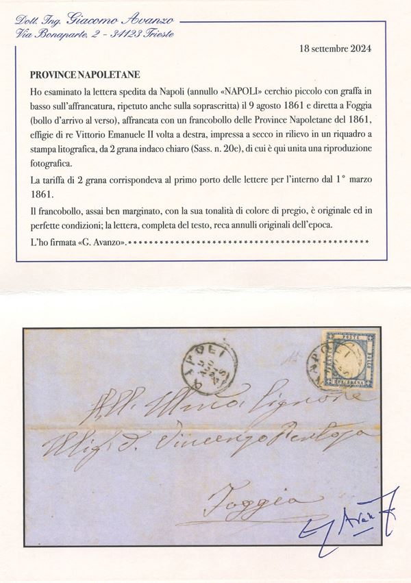 02.08.1861 - lettera da Napoli per Foggia affrancata tramite un 2gr. indaco chiaro n.20e, ottima qualità. Cat.2.200. (A+) (Cert. G. Avanzo, Alberto Diena)