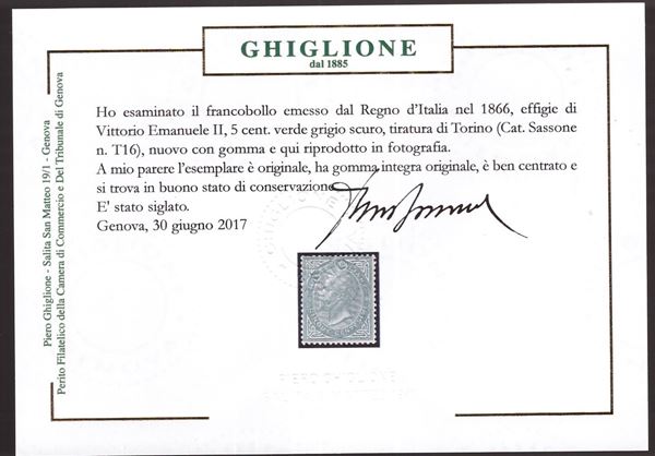 1863 - 5 cent. verde grigio scuro n.T16 nuovo con gomma integra. Cat. 8.500. (A-) (Cert. Ghiglione)