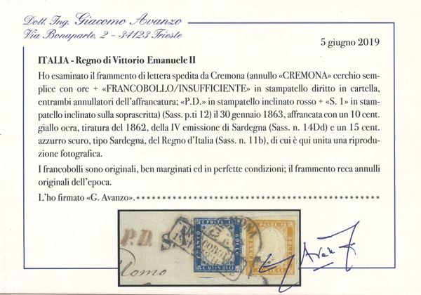 30.01.1863 - Frammento di lettera affrancato tramite Sardegna 10 cent. giallo ocra n.14Dd + regno 15 cent. litografico tipo Sardegna azzurro scuro n.11b. Sull'affrancatura il cerchio di Cremona + ''Francobollo insufficiente'' in cartella, P.D. in stampatello inclinato in rosso e S.1 stampatello inclinato in nero (pt.12). (A+) (Cert. Avanzo)