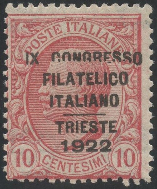 1922 - Congresso filatelico n.123/126 nuovo con gomma integra. Notata sul 10 cent. la scritta ''CONGRESSO'' incompleta, varietà inedita. (A) (Cert. Chiavarello)