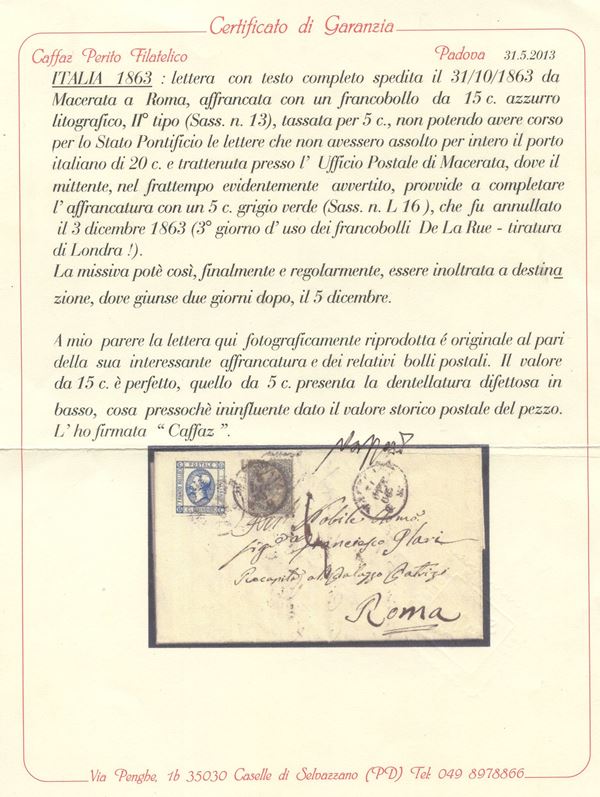 31.10.1863 - Lettera spedita da Macerata per Roma ed affrancata tramite un Francobollo da 15 cent. litografico n.13; La lettera venne trattenuta dall'ufficio di Macerata perché non affrancata sufficientemente. Successivamente, il 3 dicembre 1863, venne fatta l'aggiunta di un 5 cent. grigio verde n.L16 nel suo terzo giorno d'uso. Insieme assolutamente non comune. (A-) (Cert. Caffaz)