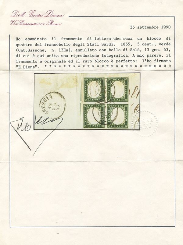 1863 - 5cent. Verde Scuro n.13D in quartina usata su grande frammento. Cat. 11.000++. (A-) (Raybaudi, Cert. En. Diena)