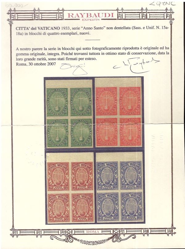 1933 - Anno Santo non dentellata n.15a/18a con bordo di foglio in alto. (LUX) (Fotocopia del certificato Raybaudi della quartina di provenienza)
