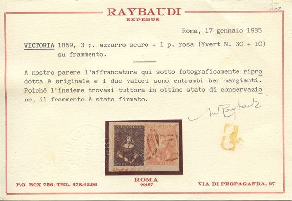 1859 - Victoria, frammento di lettera affrancato con i N. (Yvert) 3C+1C certificati da Raybaudi.