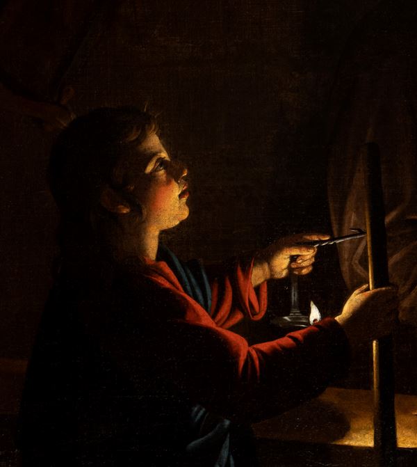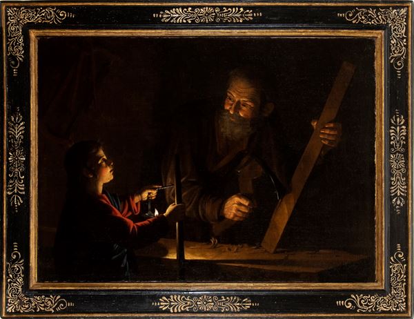 Tutte le opere che vengono radunate intorno ai due nomi, sia che li si intenda come due singoli artisti o come un’unica personalità, hanno in comune la predilezione per l’ambientazione notturna rischiarata solo dalla presenza di fonti di luce artificiale, l’essenzialità e concentrazione compositiva, il registro silenzioso e castigato, nonché naturalmente la virtuosistica padronanza degli effetti luministici, pienamente sfruttati in chiave formale, espressiva e simbolica. Come ben possiamo rilevare nella nostra tela, la luce si irraggia dal Cristo bambino e grazie anche alla fiamma della candela si riflette sul volto di Giuseppe, che incrocia lo sguardo del figlioletto con espressione amorevole e rapita. I due sono intenti a lavorare delle assi di legno, chiara anticipazione della croce che già attende Gesù al termine del suo passaggio terreno.