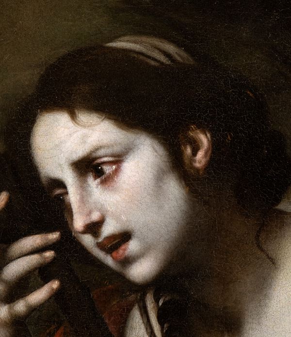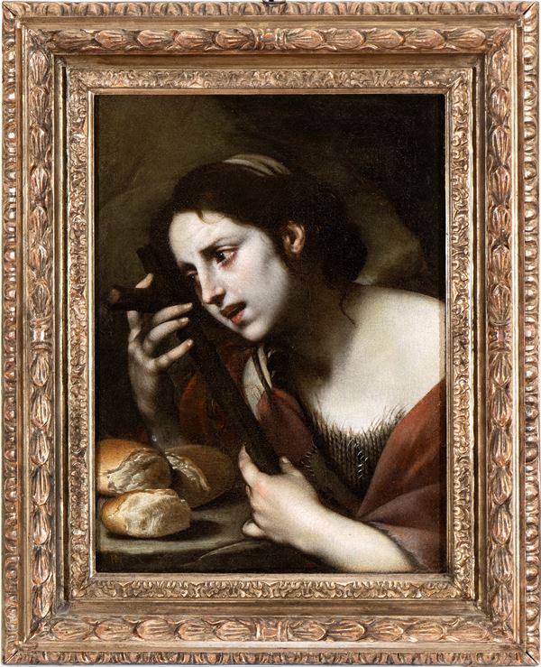 Reso noto da Ferdinando Bologna come indiscutibile dipinto autografo di Pacecco De Rosa, da principio l’iconografia del dipinto fu oggetto di una comprensibile confusione, essendo identificata la santa come Maria Maddalena. In realtà si tratta di Santa Maria Egiziaca, come dimostra l’attributo distintivo delle tre pagnotte, suo unico nutrimento durante la permanenza del deserto e simbolo della sua ascetica rinunzia a ogni bene mondano dopo la conversione seguita a una giovinezza trascorsa come cortigiana in Alessandria d’Egitto. Poche volte, nel pur cospicuo catalogo delle sue opere destinate alla devozione privata, Pacecco de Rosa si mostra così ispirato, in primo luogo dal punto di vista squisitamente pittorico, come in questa mirabile effige di santa penitente. Possiamo qui rilevare agevolmente la vicinanza del suo stile con quello del patrigno, maestro e infine socio Filippo Vitale, ma anche le tangibili relazioni formali con altri protagonisti della pittura napoletana post-caravaggesca come Massimo Stanzione, Andrea Vaccaro, Giuseppe di Guido (già Maestro di Fontanarosa) e Francesco Guarino. La santa è raffigurata in uno strettissimo primo piano, che conferisce massimo rilievo alle presenze simboliche dei pani e della croce e permette la più intensa concentrazione sul volto estatico, con le lacrime che le solcano le guance in un vortice di pathos mistico che amplifica l’effetto dell’immagine e il coinvolgimento emotivo dello spettatore. Senz’altro da accogliere la datazione fissata per l’opera da Vincenzo Pacelli fra il 1640 e il 1645, nella piena maturità dell’autore, in prossimità di altri capolavori di Pacecco come l’Agar del Museo de Arte di Ponce (Puerto Rico), la Flora del Kunsthistorisches Museum di Vienna, la Santa Dorotea della Narodni Galerie di Praga e la Sacra Famiglia già nella galleria antiquaria Toto a Bari.
