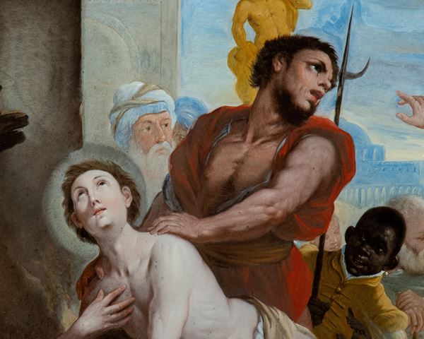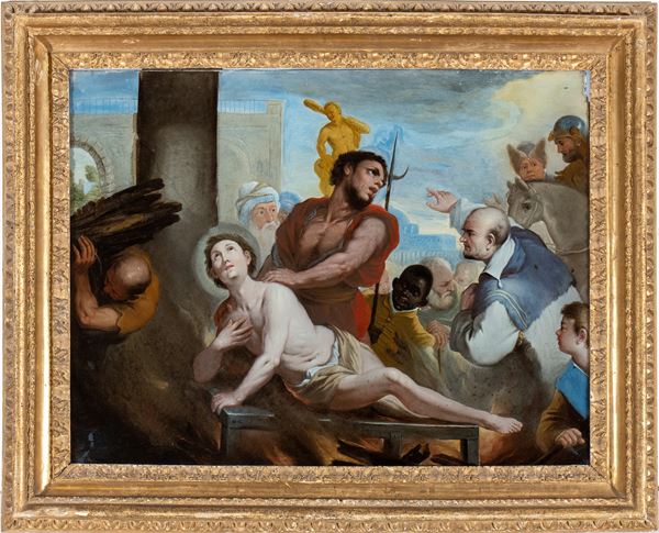 Per le imponenti dimensioni della lastra di vetro e lo smagliante nitore dell’esecuzione il presente dipinto mostra un impegno formale ben maggiore rispetto a quello riscontrabile in tutte le opere eseguite sullo stesso supporto sin qui ricondotte alla mano di Luca Giordano. La recente riscoperta di un suo monumentale dipinto su tela di analogo soggetto - da considerare tra i raggiungimenti più alti della giovinezza del pittore, verso il 1660 - permette di ancorare con sicurezza al suo catalogo il dipinto che qui si illustra. La nostra versione del Martirio di San Lorenzo è infatti perfettamente speculare a quella su tela, il che indica la possibilità di una genesi comune. L’impianto della scena, con le architetture digradanti verso la statua di Ercole e lo scorcio di paesaggio, testimonia l’impressione suscitata in Giordano dalla pittura veneziana del Cinquecento durante il suo primo viaggio in Laguna, nel 1653: e l’aguzzino che poggia la mano sulla spalla del santo costituisce un vero e proprio tributo alla figura analoga che Tiziano aveva posto nel ‘Martirio di San Lorenzo’ a Venezia, Chiesa dei Gesuati. Un ulteriore confronto all’interno della produzione giovanile di Giordano è rappresentato da un dipinto già a Milano, Collezione Riva, noto oggi solo attraverso una riproduzione in bianco e nero nella Fototeca Zeri (cfr. Fototeca Zeri, scheda 52650). Dal punto di vista stilistico l’opera qui in oggetto risponde alla tendenza dominante nella pittura di Giordano del settimo decennio, contrassegnata da una tavolozza ispirata ai toni squillanti di Paolo Veronese, ulteriormente enfatizzati dall’esecuzione su vetro. Sin dalla Vita dedicata da Bernardo de’ Dominici all’artista nel Settecento è noto come Luca Giordano sia stato un virtuoso della tecnica della pittura su vetro, e che la sua attività in tale campo si sia sviluppata al punto da formare una vera e propria bottega specializzata. Tra le poche opere su vetro convincentemente ritenuti autografi di Giordano si possono qui ricordare l’Adorazione dei Magi e l’Adorazione dei pastori a San Ildefonso, Granja Real, datati 1688 (cf. Ferrari-Scavizzi, Luca Giordano, cit., I: p. 322, A435; II: p. 705, figg. 567- 568), nonché un Ercole e Onfale in collezione privata a Milano. Il presente dipinto, comunque, presenta un grado di finitura e di accuratezza della pennellata - capace di definire con somma precisione i dettagli più minuti - estremamente più alto rispetto della gran parte dei vetri riferiti a Luca Giordano. La datazione dell’opera al settimo decennio del Seicento, corrisponde, del resto, a una fase della sua carriera in cui l’artista non era ancora pienamente affermato e stava aprendo il suo linguaggio verso sorprendenti traiettorie di libera sperimentazione tecnica e formale.