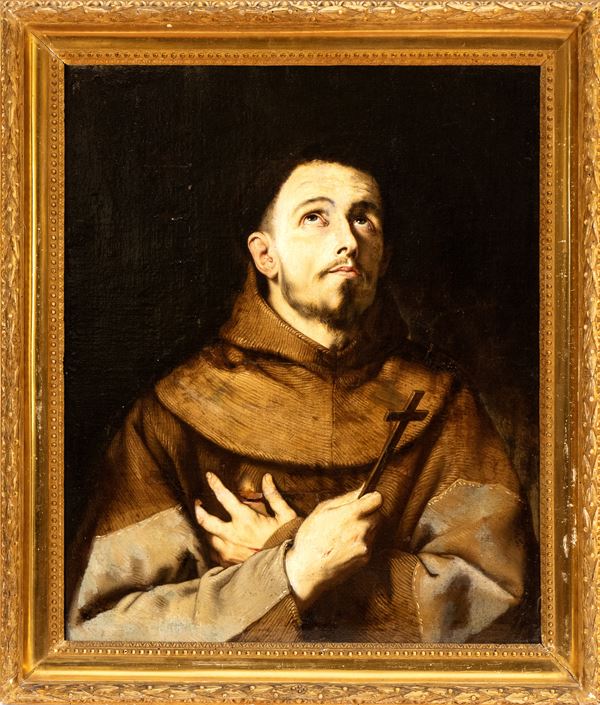 Dal punto di vista compositivo il prototipo del presente dipinto può essere riconosciuto nello stupendo San Francesco conservato in Palazzo Pitti a Firenze, firmato e datato 1641. Rispetto alla versione Pitti la nostra tela esibisce molteplici e rilevanti variazioni iconografiche: innanzitutto il Santo di Assisi è raffigurato più giovane, con una rada peluria in luogo della lunga e fitta barba che lo caratterizza nel dipinto fiorentino, e il suo sguardo è più accentuatamente rivolto verso l’alto; il taglio della nostra immagine risulta inoltre accorciato nella porzione inferiore, ma ben più rilevante è la differenza che riguarda mani e braccia: nell’esemplare Pitti, infatti, sono congiunte a reggere un teschio, mentre nella nostra versione sono incrociate, la mano destra stringendo saldamente un crocifisso, laddove la sinistra è poggiata sul petto in corrispondenza della lacerazione del saio che rende ben visibile la ferita al costato. Per la sua essenzialità e il suo intenso misticismo quest’immagine di magistrale compiutezza formale fu più volte replicata da Ribera e dal suo studio con diverse varianti compositive, compresa una redazione in cui il santo è raffigurato di profilo. Della nostra tipologia, con la croce e le braccia incrociate, è nota un’unica altra versione, già in collezione privata a Novi Ligure e reputata autografa da Spinosa, che presenta l’identico taglio d’immagine della nostra. Un’altra, simile ma non identica, firmata e datata 1648, è passata recentemente in asta da Dorotheum (24/04/2024, l. 89). Per la sua elevata qualità, in particolare nel volto e nelle mani, e l’accurato realismo, con le cuciture del saio bene in vista, le unghie e i peli della barba minutamente descritti, la precisione chirurgica del taglio sul costato, il nostro bel dipinto inedito si configura come un nobile prodotto dell’atelier di Ribera sotto la stretta supervisione del maestro, da collocare cronologicamente in prossimità dei suoi prototipi, nella seconda metà del quinto decennio.