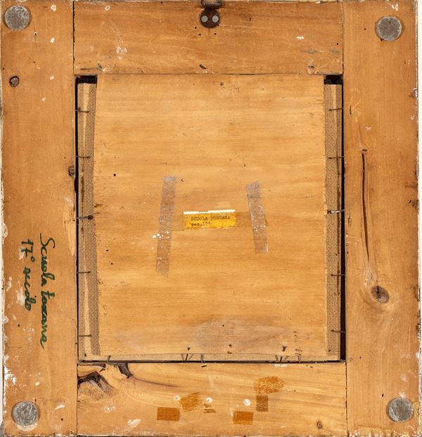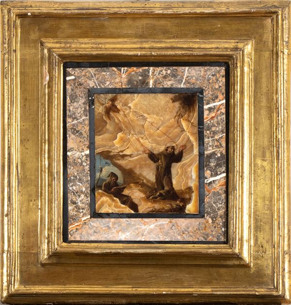 La moda per la pittura eseguita su pietre e marmi policromi prese piede a Roma negli ultimi decenni del Cinquecento, coinvolgendo anche artisti di primissimo piano come il Cavalier d’Arpino, e si diffuse ben presto in molti ambienti artistici italiani ed europei, a partire da Firenze. Figura cardinale nel processo di affermazione di questo nuovo genere, a mezza via tra pittura, arte suntuaria e oggettistica di alto arredo, fu il fiorentino Antonio Tempesta (1555-1630) che ne eseguì un gran numero per alcune delle più prestigiose committenze capitoline. Gli specialisti di questo genere furono impegnati a sfruttare virtuosisticamente le peculiarità coloristiche e le movimentate linee degli strati sedimentari dei supporti lapidei impiegati: fra questi, l’alabatro (così come l’alberese, la cosiddetta pietra paesina) si prestò particolarmente a delineare gli sfondi paesaggistici degli episodi raffigurati. Ne fornisce una chiara esemplificazione il bell’esemplare qui in oggetto, raffigurante il momento cruciale in cui San Francesco riceve le stigmate alla presenza del fido frate Leone, testimonianza del diffuso impiego dei supporti di pietra anche per dipinti di destinazione devozionale. Merita di essere rilevata la vicinanza con l’arte di Antonio Tempesta, come suggerisce il confronto con opere come la Vocazione di S. Pietro e l’Adorazione dei Magi, entrambi nella Galleria Borghese in Roma, o il Cristo cammina sulle acque della collezione Giulini a Milano.