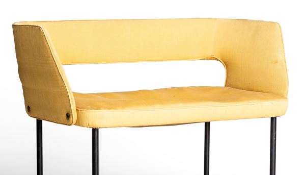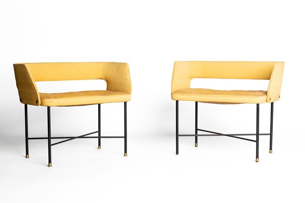 Sedie vintage gialle realizzate con struttura in metallo verniciato astragale, rivestimento in tessuto e ottone