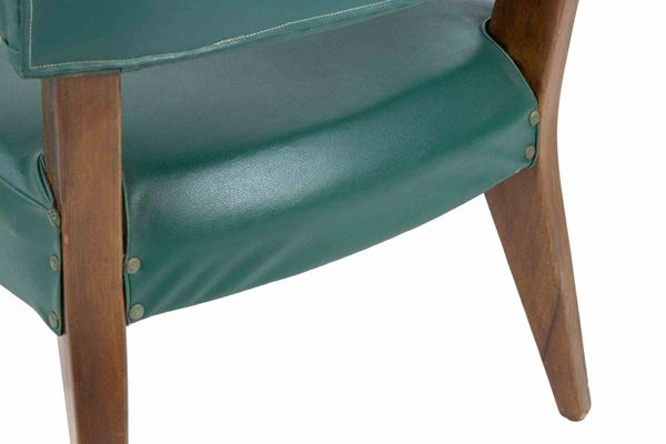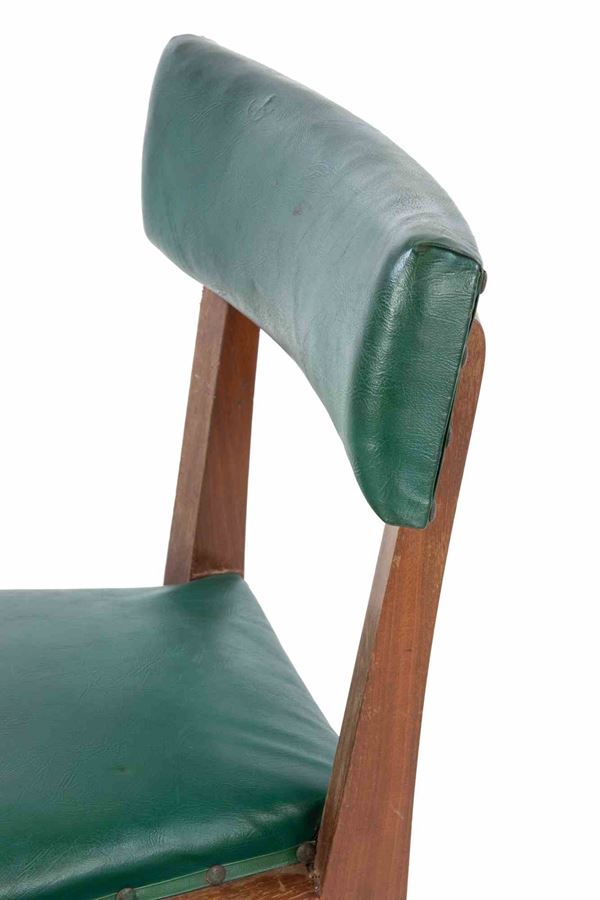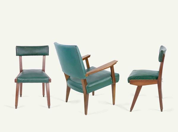 Set vintage di 1 poltrona e 2 sedie in legno e pelle vinilica imbottita.