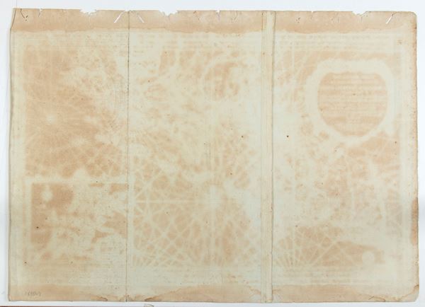 Acquaforte e bulino, ca. 630 x 880 mm. Stampata su carta vergata pesante. Due consuete pieghe editoriali. Foglio brunito, con alcune macchie sui margini e fori lungo il margine superiore. Per il resto, in buone condizioni.
