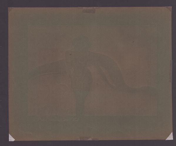 Stupenda impressione a tre colori su carta color grigio. In perfette condizioni salvo dei residui di scotch al verso.