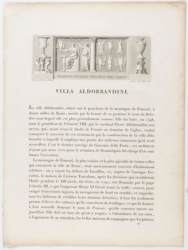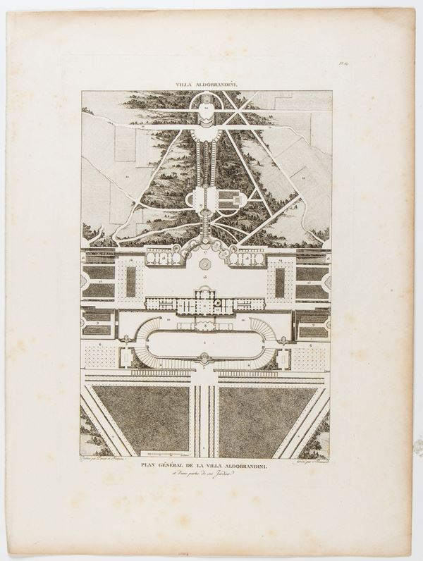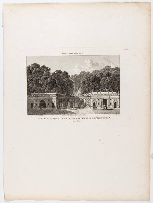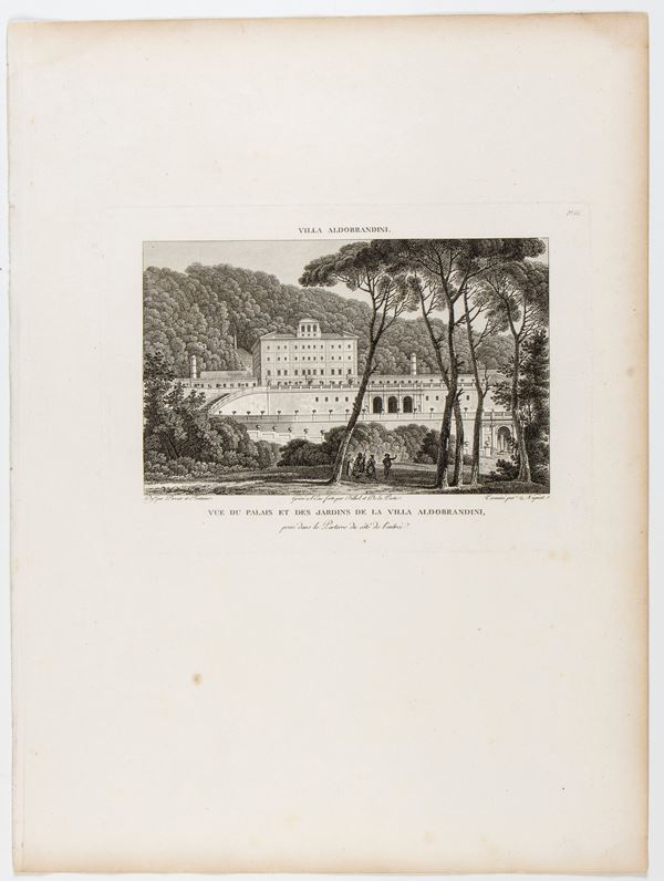 Lotto di 3 tavole raffiguranti Villa Aldobrandini a Frascati. Bulino e acquaforte, 480 x 355 mm (cad. foglio). Incluse 2 tavole con testo esplicativo. Belle impressioni su carta vergata. In ottimo stato, salvo leggere bruniture lungo i bordi.
