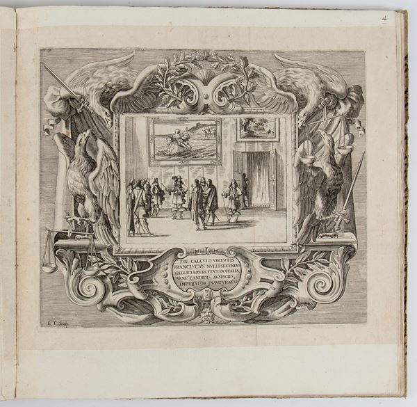 – 13 tavole di Bartolomeo Fenice, tratte da L'idea di un principe et eroe cristiano in Francesco I d'Este, di Modena... (1659). Acquaforte, 310 x 260 mm circa per foglio. Le tavole sono controfondate sui fogli di album.