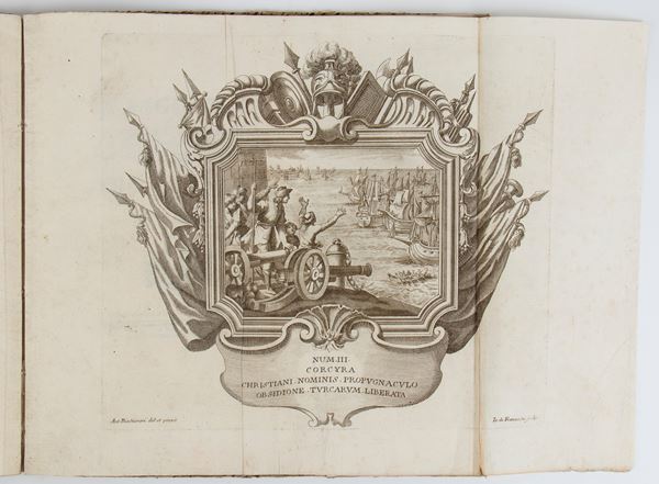 – 18 tavole di vari incisori, tratte da Ragguaglio del funebre apparato e magnifico mausoleo eretto nella regia chiesa di S. Antonio dell'inclita nazione portoghese in Roma. Per la morte di Giovanni V... (1751). Acquaforte, 365 x 490 mm circa per foglio. Le tavole sono unite dopo, ciascuna con una piega verticale.