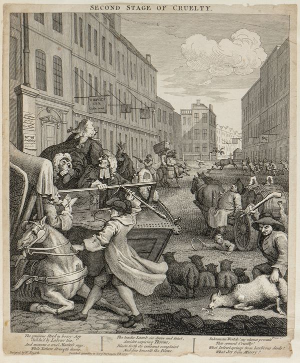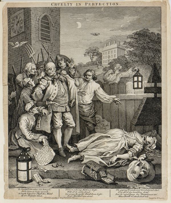 lotto di 2 incisioni dalla serie The Four Stages of Cruelty. Acquaforte e bulino, 380 x 320 mm ca. (cad. foglio). Paulson 188 e 189.
