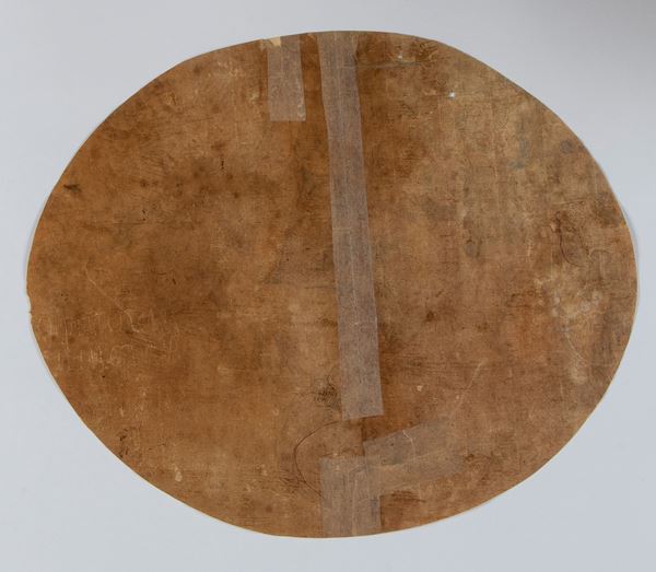 Penna, inchiostro bruno su carta vergata marroncina ritagliata in ovale