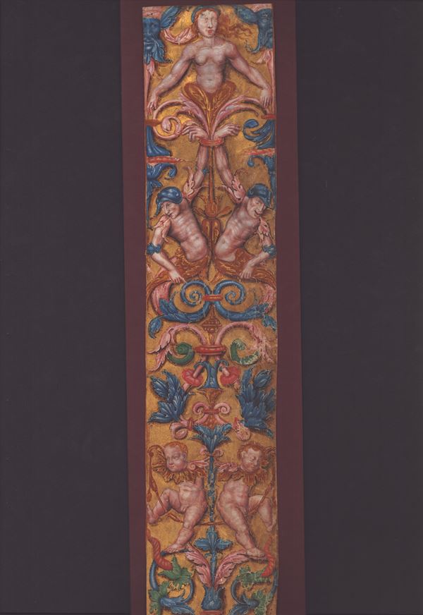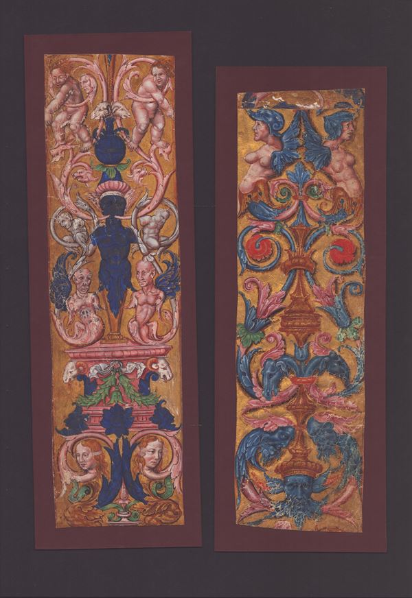 Lotto di 3 fogli. Pigmenti policromi e foglia d'oro su pergamena, 315 x 95, 340 x 94, 427 x 92 mm.