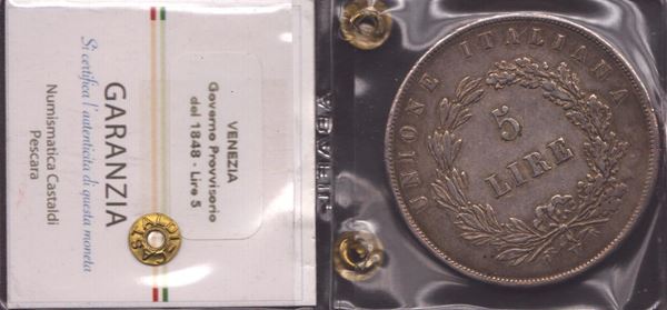 VENEZIA. Governo Provvisorio di Venezia (1848-1849). 5 lire 1848, I Tipo 22 Marzo. Ag (24,90 g; 37,3 mm)