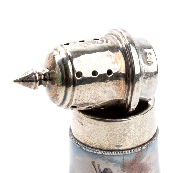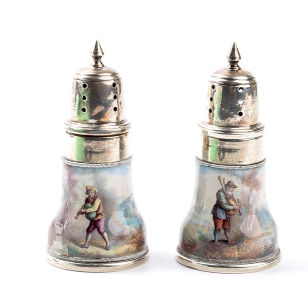 Coppia di saliere italiane in argento e smalti, XX secolo