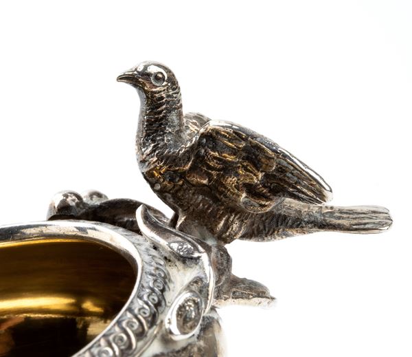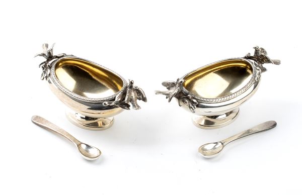 di forma ovale, con decorazioni vegetali e prese laterali a forma di volatile; interni dorati. Le saliere sono dotate di due cucchiaini.