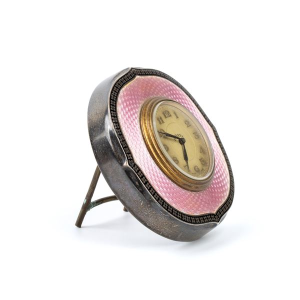 Cassa di forma circolare sagomata in argento 925/1000 con fronte in smalto guilloché nei toni del rosa e cornice in smalto nero con decori a stelline. Quadrante dorato con numeri arabi e sfere nere riportante le iscrizioni "8 days - Swiss made". Nella parte posteriore della cassa in ottone "SWISS MADE".