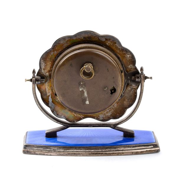 Cassa in argento 925/1000 con smalti guilloché nei toni del blu con decori floreali policromi poggiante su basamento basculante, quadrante bianco con numeri romani e sfere nere.