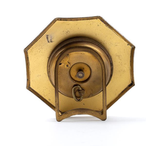 Cassa ottagonale in metallo dorato con smalti guilloché nei toni del blu, quadrante argenté con numeri arabi e sfere nere riportante le iscrizioni "8 Days - Swiss made".
