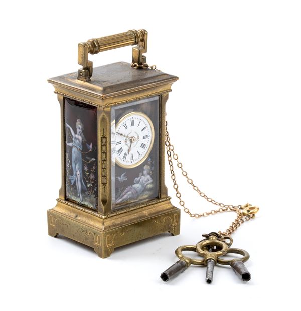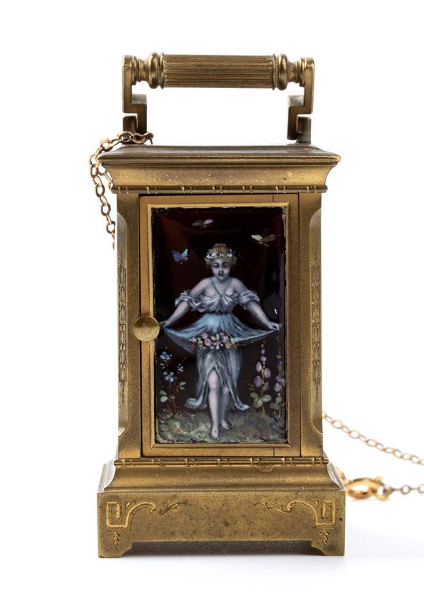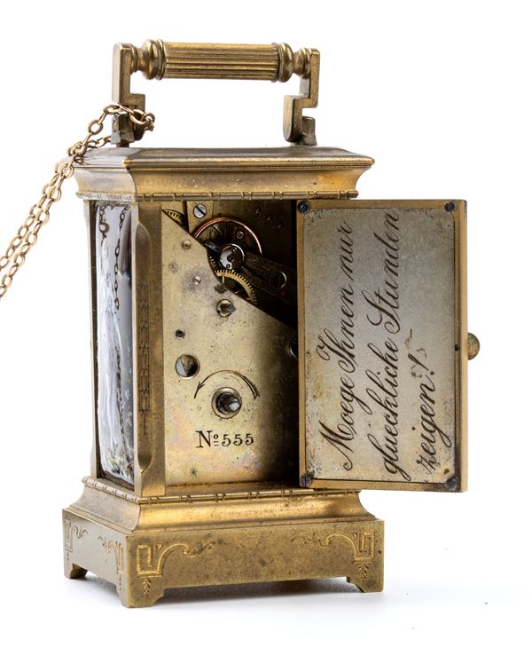 Cassa a "cappuccina" in metallo dorato smaltato in policromia con figure femminili, quadrante bianco con numeri arabi e sfere nere. Rimessa delle ore e carica a chiave. Nella parte sottostante e sul movimento il numero "555". Nella parte interna dello sportellino la scritta "Moege Ihnen mur glueckliche Stunden reigen!" (Tedesco per: "Che tu possa avere ore felici!").