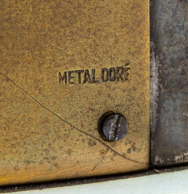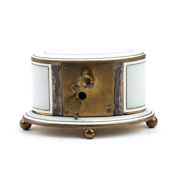 Cassa di forma ovale in metallo dorato con smalti guilloché nei toni dell'azzurro con cornici bianche, quadrante dorato con numeri arabi e sfere nere. Nella parte posteriore, "Metal Dore". Rimessa delle ore a chiave.