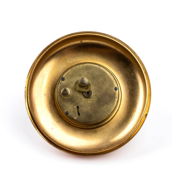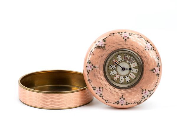 Cassa circolare con coperchio ad innesto in metallo dorato con smalti guilloché nei toni del rosa con decori floreali policromi. Quadrante dorato con numeri a forma di carte da gioco e sfere nere riportante l'iscrizione "France". Nella parte posteriore, le iscrizioni "BREVETE FRANCE ET ETRANGER".