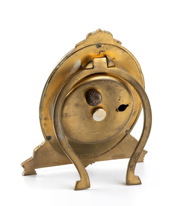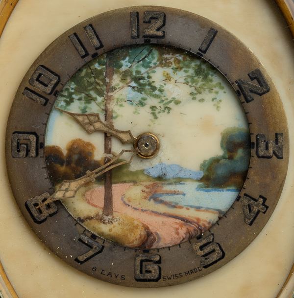 cassa ovale poggiante su un basamento decorato con smalti policromi, cornice nei toni del beige, quadrante dipinto con un paessagio fluviale con numeri arabi e sfere luminescenti, riportante l'iscrizione "8 Days - Swiss Made".