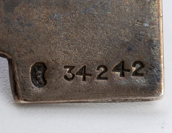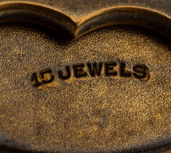 Punzonato con i marchi per l'argento 935/1000 in uso in svizzera dal 1882 al 1934, con le iscrizioni "34242" e il simbolo di un cuore trafitto da una freccia. Cassa orologio con iscrizione " 15 Jewels".