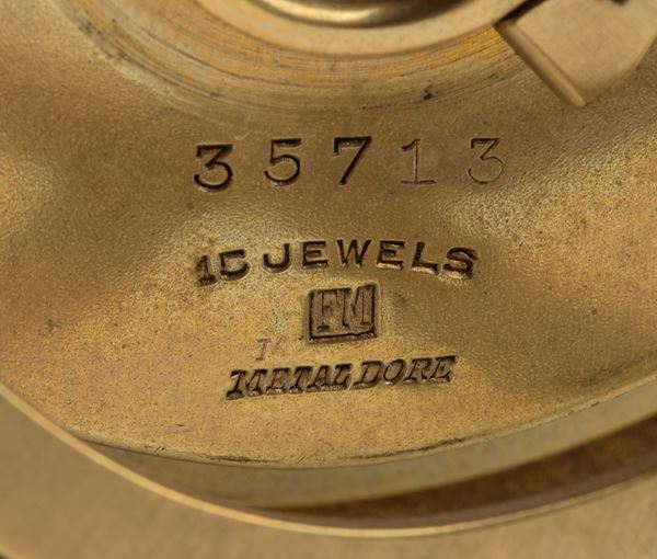Punzonato con i marchi per l'argento 935/1000 in uso in svizzera dal 1882 al 1934, con le iscrizioni "Argent doré - 0,935 - 35713" e il simbolo di un cuore trafitto da una freccia. Nella parte posteriore della cassa dell'orologio "15 Jewels - FM - 35713".