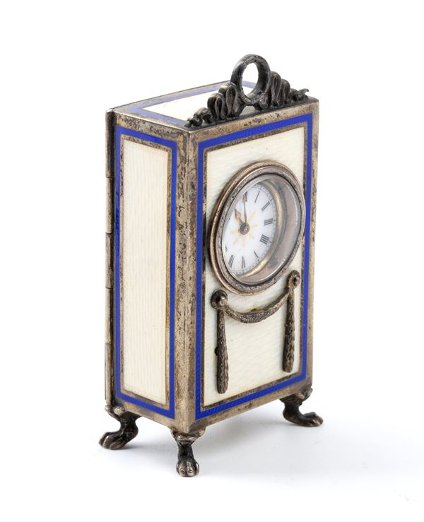 Cassa di forma rettangolare in argento 800/1000 con smalti guilloché nei toni del panna con cornici blu, quadrante in smalto bianco con numeri romani e sfere nere. Rimessa delle ore e carica a chiave.