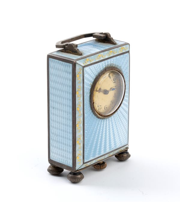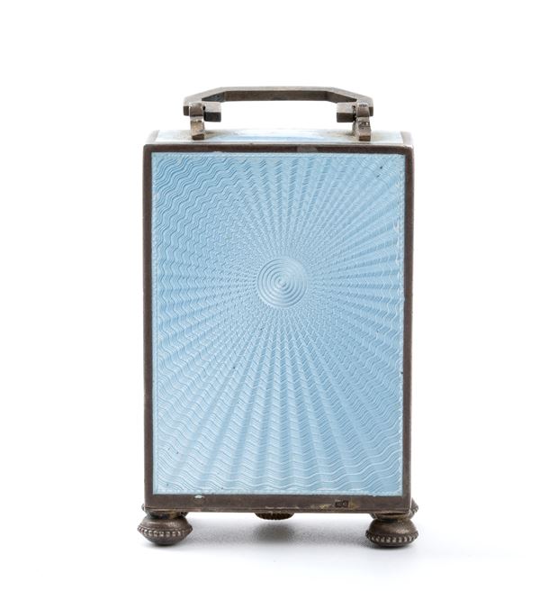 Cassa di forma rettangolare in argento 800/1000 con smalti guilloché nei toni dell'azzurro con decori floreali dorati, quadrante dorato con numeri arabi e sfere nere.