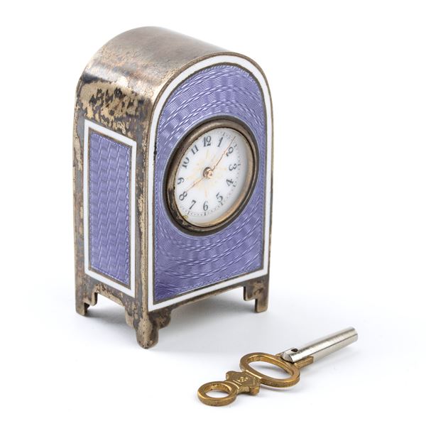 Cassa a "cappuccina" in argento 800/1000 e smalti guilloché nei toni del viola con cornici bianche, quadrante in smalto bianco con numeri arabi e sfere dorate.