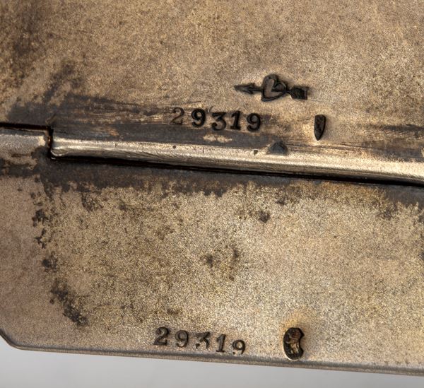 Punzonato con i marchi per l'argento 935/1000 in uso in svizzera dal 1882 al 1934, con i numeri seriali "29319" e con il simbolo di un cuore trafitto da una freccia.