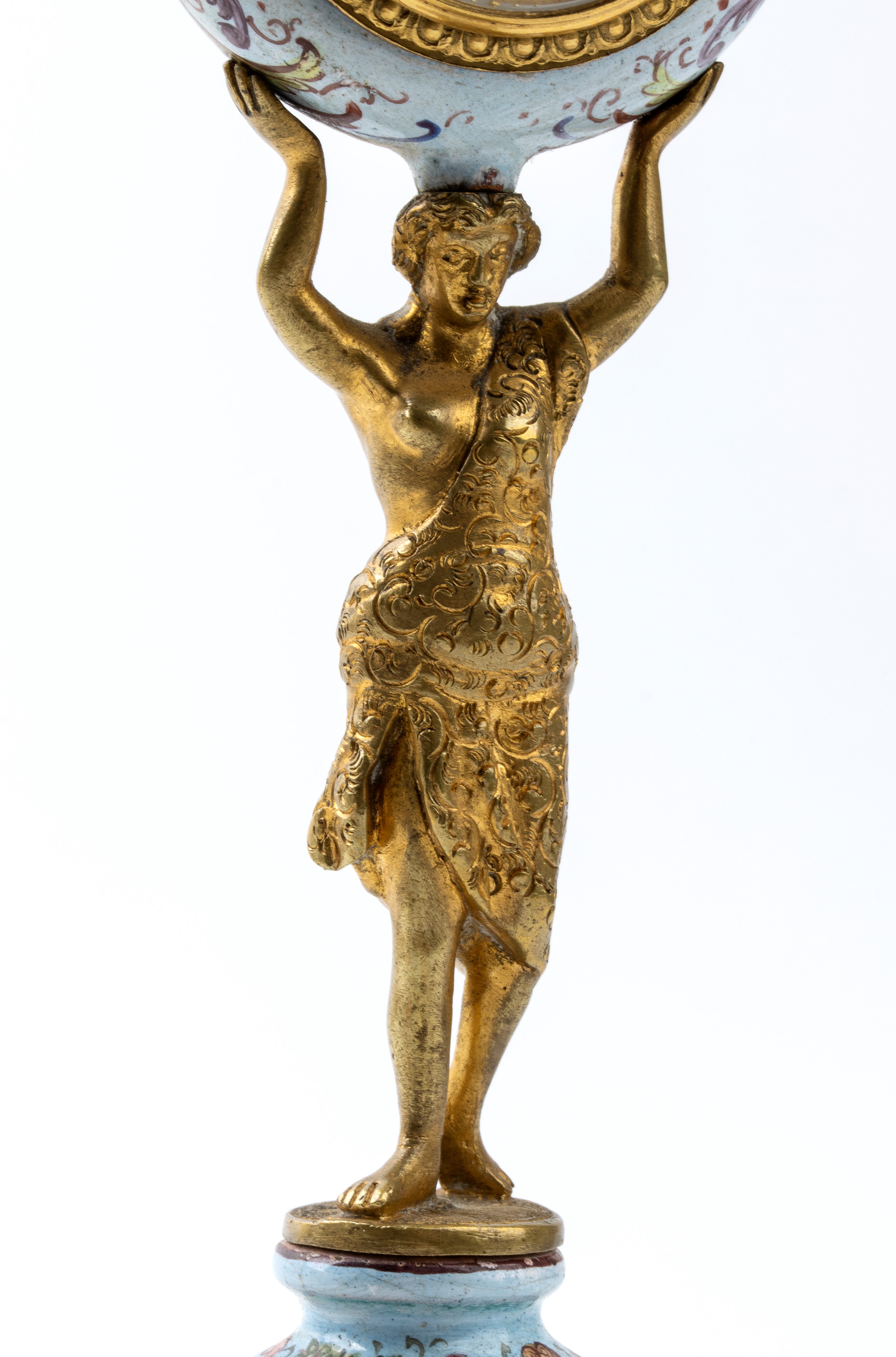 Cassa in metallo dorato con base e corpo smaltati in policromia con scene mitologiche collegate da un fauno fusa e dorata. Quadrante in smalto bianco con numeri romani, numeri arabi e sfere nere nere. Rimessa delle ore e carica a chiave.