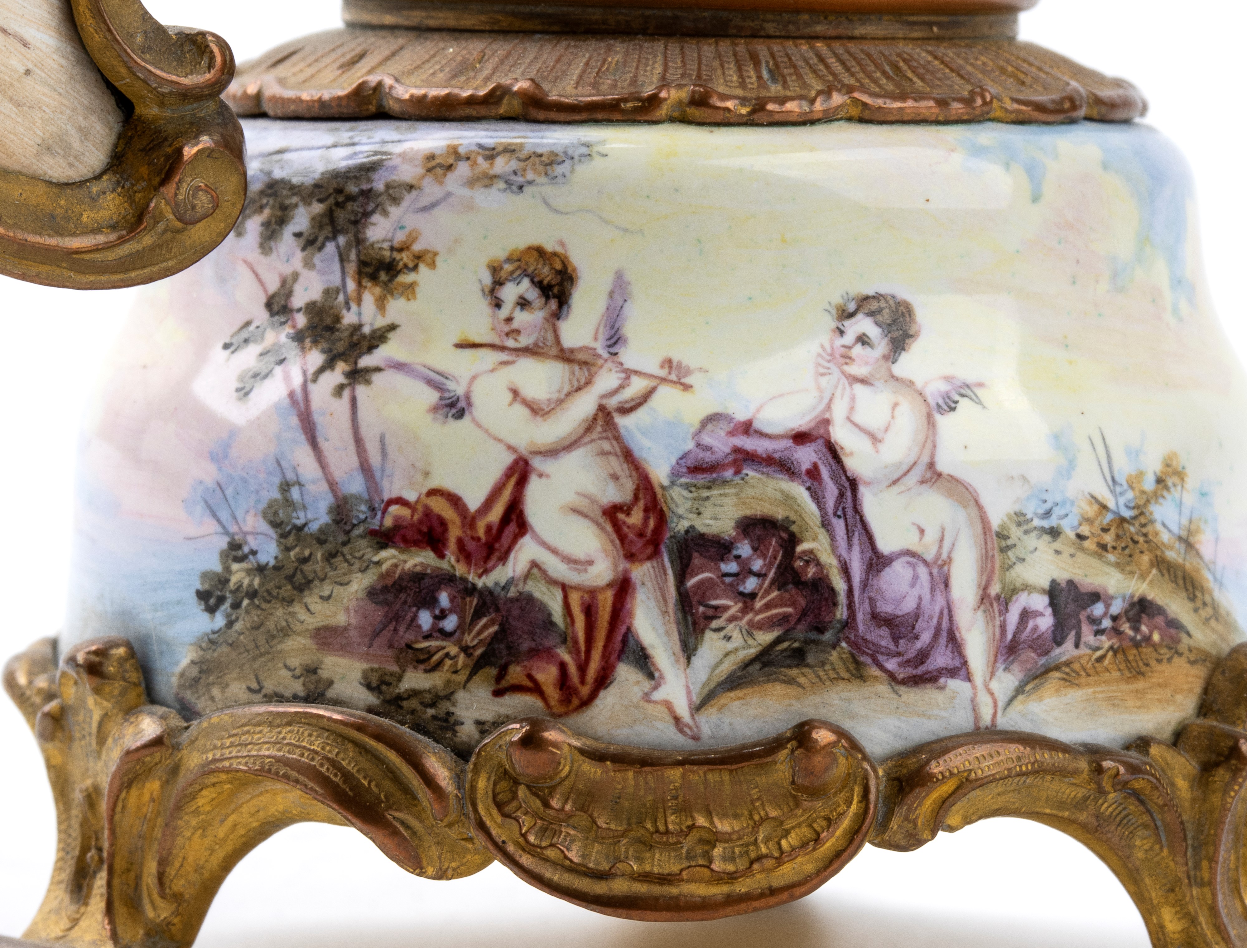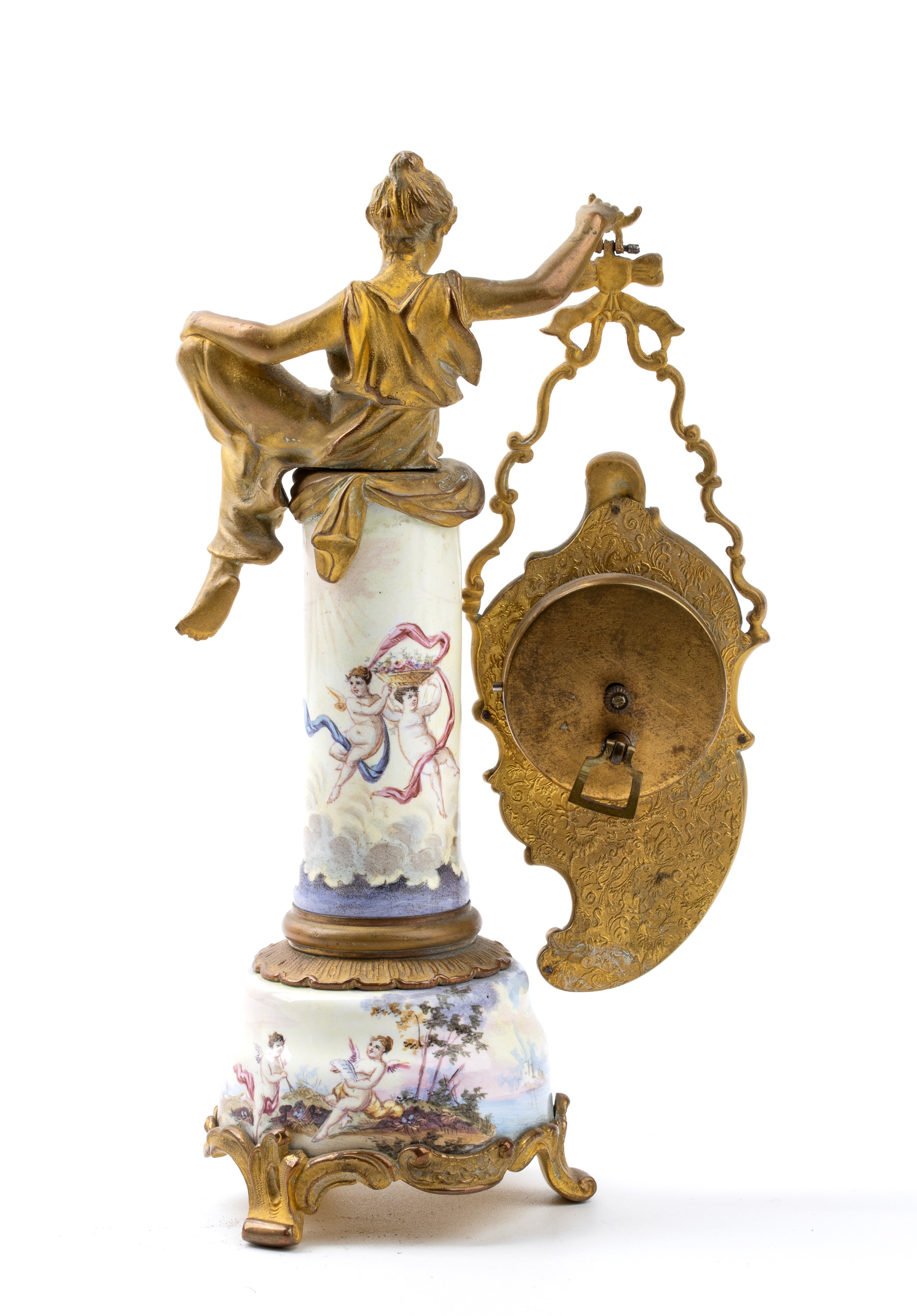 Base circolare con fusto a colonna, in bronzo dorato con base e corpo smaltati in policromia con scene galanti e putti; nella parte superiore una figura femminile che sorregge l'orologio con quadrante in smalto bianco e sfere nere.